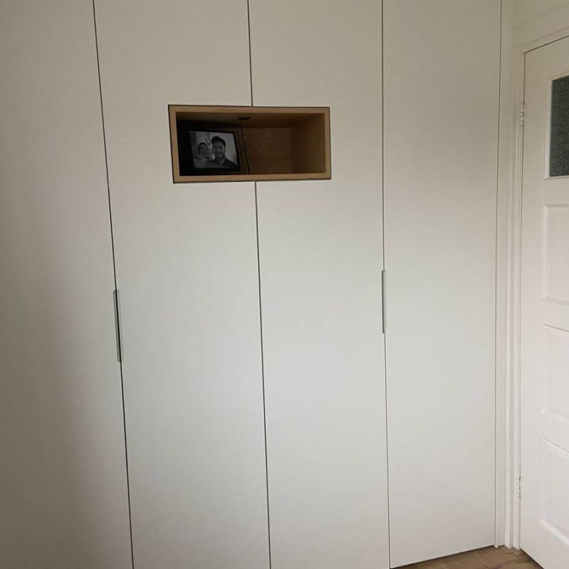 De garderobekast is volledig afgestemd op de ruimte waarin hij staat — van wand tot wand en van vloer tot plafond. Geen loze hoeken, geen verloren centimeters: elke lijn, naad en aansluiting is zorgvuldig uitgewerkt. De kast vormt zo een architectonisch onderdeel van de slaapkamer, alsof hij altijd al deel uitmaakte van het ontwerp. De maatvoering en indeling zijn afgestemd op de persoonlijke wensen van de bewoners. Van royale hanggedeeltes en overzichtelijke lades tot slimme vakverdelingen voor accessoires — elk detail is doordacht en functioneel.