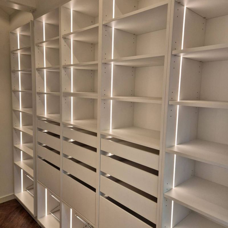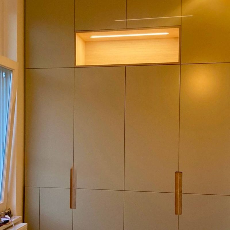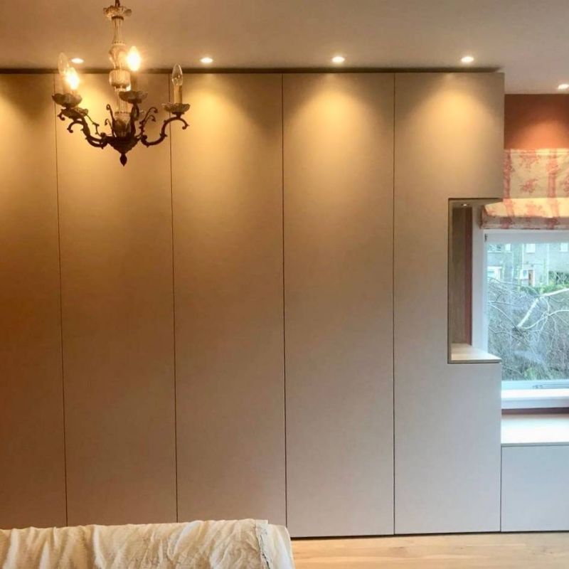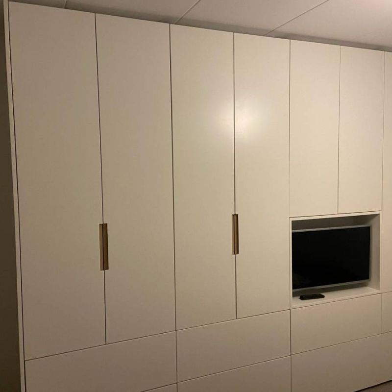 De garderobekast is vervaardigd uit kwaliteitsmaterialen die garant staan voor duurzaamheid en een verfijnde uitstraling. Afhankelijk van het interieur is gekozen voor een combinatie van matgelakte panelen, houtfineer of hoogwaardig HPL met een zijdezachte touch. De afwerking is tot in perfectie uitgevoerd: onzichtbare scharnieren, verzonken grepen of push-to-open systemen zorgen voor een strak en modern beeld zonder visuele onderbrekingen.